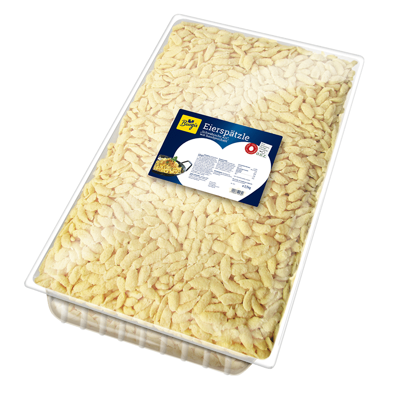 Nicht nur im Schwabenland, auch in anderen Regionen, ist man sich einig: je mehr frische Eier im Teig landen, desto besser werden auch die Spätzle. Diese Weisheit haben wir uns für die Eierspätzle „Schwäbische Art“ zu Herzen genommen und bei dieser Spezialität besonders viel Liebe und Eier reingesteckt. Und zwar ausschließlich Eier aus Bodenhaltung. Deshalb schmecken diese goldgelben Klassiker auch wie hausgemacht – egal, ob als Beilage zu klassischen Soßengerichten oder als Hauptgericht in Form von Käsespätzle. Überzeugen Sie sich selbst!