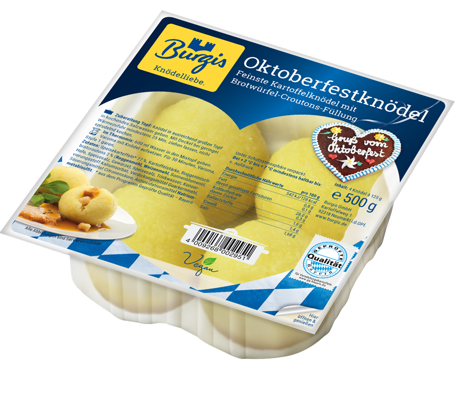 Wenn auf der Wiesn „ozapft is“, ist unser Burgis Oktoberfestknödel mittendrin. Dieser mit gerösteten Brotwürfeln gefüllte Kloßklassiker passt perfekt zu berühmten Wiesnschmankerln, wie Enten- oder Schweinebraten. Und die Mass Bier schmeckt damit auch noch ein bisschen besser. Der Burgis Oktoberfestknödel wird zu 100 % aus frisch geriebenen Kartoffeln hergestellt, die mit dem Qualitätssiegel „Geprüfte Qualität – Bayern“ ausgezeichnet sind.