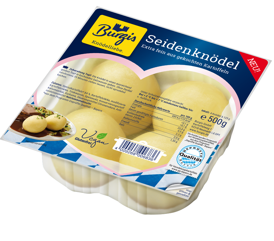 Mit ihrer glatten, seidenen Struktur ist der Burgis Seidenknödel, ein Kartoffelknödel aus gekochten Kartoffeln, die ideale Beilage zu feinen Soßengerichten wie Wild, Rind oder auch zartem Geflügel. Diese Seidenknödel werden mit größter Sorgfalt und nach hohen Qualitätsstandards hergestellt – ausschließlich aus Kartoffeln des Programms „Geprüfte Qualität – Bayern“. Durch die extra feine Struktur und den milden, natürlichen Geschmack passen sie hervorragend zu aromatischen Saucen und verleihen jedem Gericht einen besonderen Genussmoment. Dank dieser sorgfältigen Zubereitung sind sie auch eine wunderbare Wahl für festliche Anlässe oder ein besonderes Sonntagsessen.