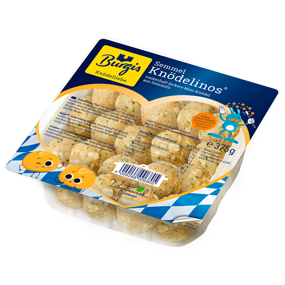 Die Burgis Semmel-Knödelinos®: Original bayerisch und im originellen Mini-Format. Klein, aber fein sind sie in wenigen Minuten zubereitet, gelingen garantiert und sorgen für den gewissen Pfiff auf dem Tisch. Die Mini Semmelknödel passen genauso zu Herzhaftem, wie zur leichten Sommerküche. Wunderbar würzig und herrlich vielseitig sind die Semmel-Knödelinos® ideal als Füllung oder kulinarisches i-Tüpfelchen leckerer Salatkreationen. Einfach magisch!